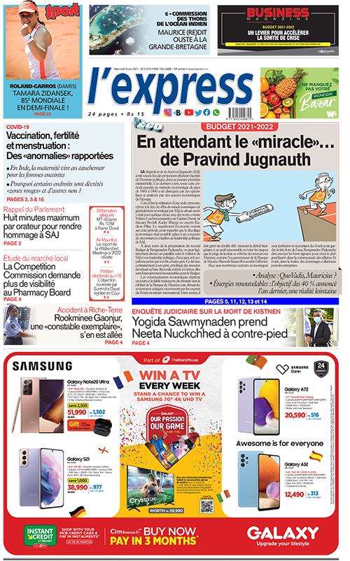 En une de l'express: Budget 2021-2022 : En attendant le «miracle»… de Pravind Jugnauth ; Autre titre: Rappel du Parlement : Huit minutes maximum par orateur pour rendre hommage à SAJ.