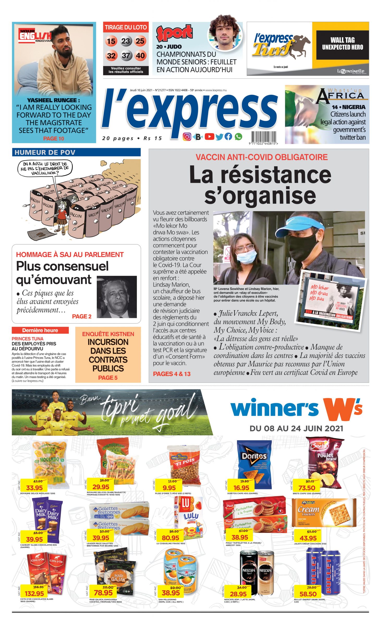 En Une de l'express de ce jeudi 10 juin; Vaccin anti-covid obligatoire: La résistance s’organise; Autre titre; Princes Tuna: des employés pris au dépourvu.
