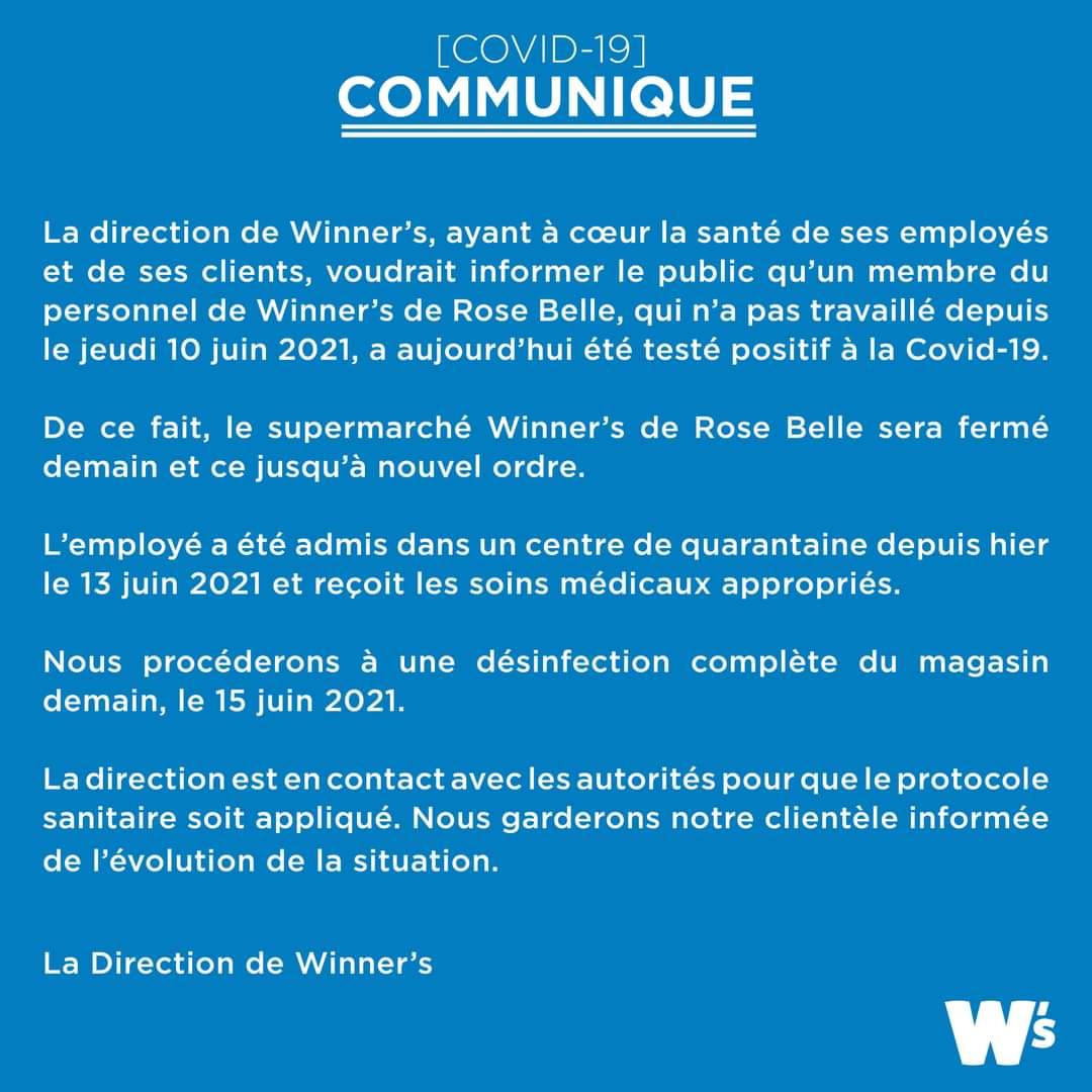 Le communiqué a été émis par la direction du supermarché en ce lundi 14 juin. Un employé de Winner's de Rose-Belle a été testé positif au Covid-19. De ce fait, le supermarché restera fermé demain et ce jusqu'à nouvel ordre.