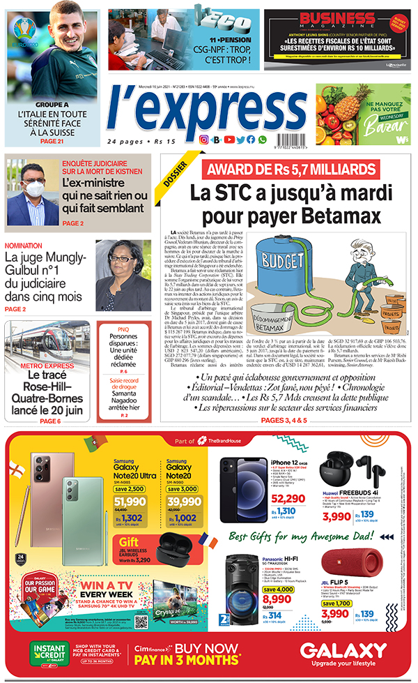 En une de l'express: Award de Rs 5,7 milliards: la STC a jusqu’à mardi pour payer Betamax ; Autre titre: Enquête judiciaire sur la mort de Kistnen: l’ex-ministre qui ne sait rien.