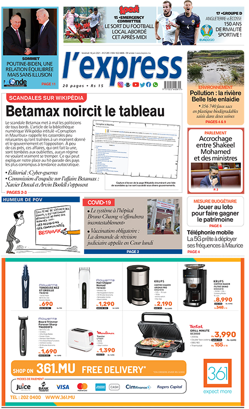 En une de l'express: Scandales sur Wikipédia : Betamax noircit le tableau; Autre titre: Parlement : Accrochage entre Shakeel Mohamed et des ministres.