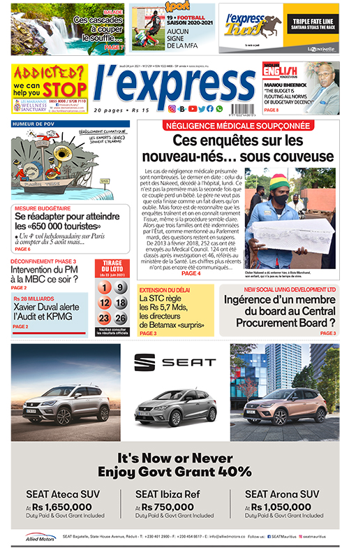 En une de l'express: Négligence médicale soupçonnée : Ces enquêtes sur les nouveau-nés… sous couveuse; Autre titre: Extension du délai : La STC règle les Rs 5,7 Mds, les directeurs de Betamax «surpris».