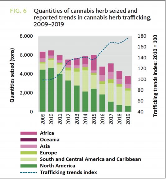 Pendant la pandémie, la consommation du cannabis a augmenté dans 42 % des pays. Dans une enquête en Europe, il a été prouvé que l’achat de petites quantités de cannabis sur le Dark Web est passé de 14 000 en janvier 2020 à 18 000 en mars 2020. Les prix ont augmenté dans 39 % des pays et ont baissé dans 37 %. S’il n’y a pas de données fiables sur la production, l’utilisation en hausse et les saisies fréquentes donnent une indication que les plantations globales ont augmentée. Le rapport fait aussi ressortir qu’en 15 ans, le taux de THC contenu dans le cannabis a augmenté de quatre fois. Une des raisons qui expliquent la hausse de la consommation est le fait que le cannabis est que les effets médicaux du gandia sont de plus en plus vantés. De ce fait, la jeune population se défait de la notion de «drogue» liée au cannabis. Cependant, les saisies de cannabis ne cessent de diminuer d’année en année. Cela est expliqué par le fait que de plus en plus de pays passent des lois moins sévères, vont vers la dépénalisation ou l’autorisation de l’usage récréatif.
