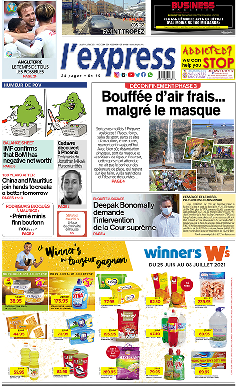 En une de l'express: Déconfinement phase 3 : Bouffée d’air frais... malgré le masque ; Autre titre: Enquête judiciaire : Deepak Bonomally demande l’intervention de la Cour suprême.