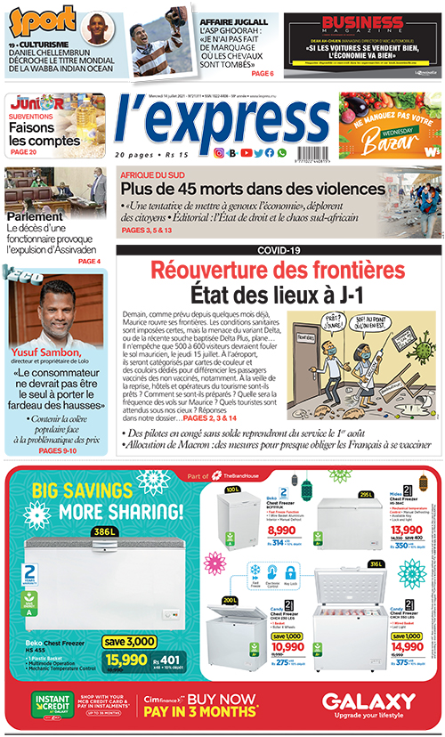 En une de l'express de ce mercredi 14 juillet: Covid-19 - Réouverture des frontières : État des lieux à J-1, Autre titre: Parlement : Le décès d’une fonctionnaire provoque l’expulsion d’Assirvaden.