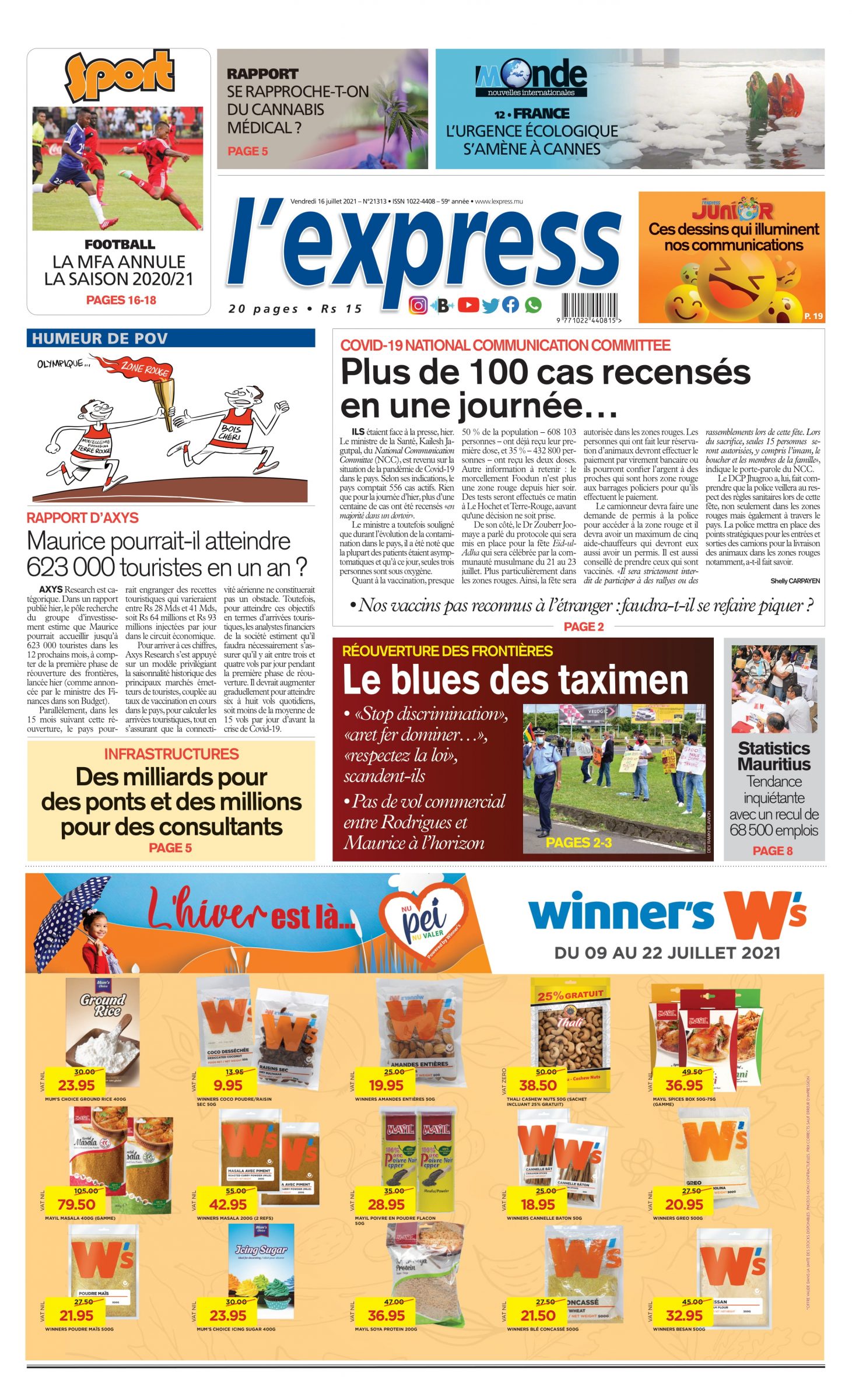 En Une de l'express ; Plus de 100 cas recensés en une journée…;Autre titre: Maurice pourrait-il atteindre 623 000 touristes en un an ?