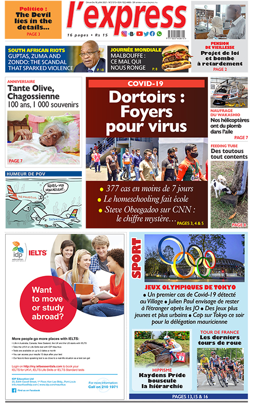 En une de l'express de ce dimanche 18 juillet: COVID-19- Dortoirs : Foyers pour virus, Autre titre: Naufrage du Wakashio : Nos hélicoptères ont du plomb dans l’aile.