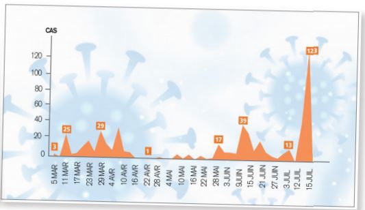 Le problème concernant ces données ne s’arrête pas là. Sur les sites de compilation de données Worldometer, le décompte journalier des cas s’arrête au 29 juin alors que sur Our world in data, le pays affiche zéro cas depuis le 8 juillet. Mais sur le site de l’Organisation mondiale de la santé, les données sont semblables à celles du ministère. Qu’en est-il réellement ?