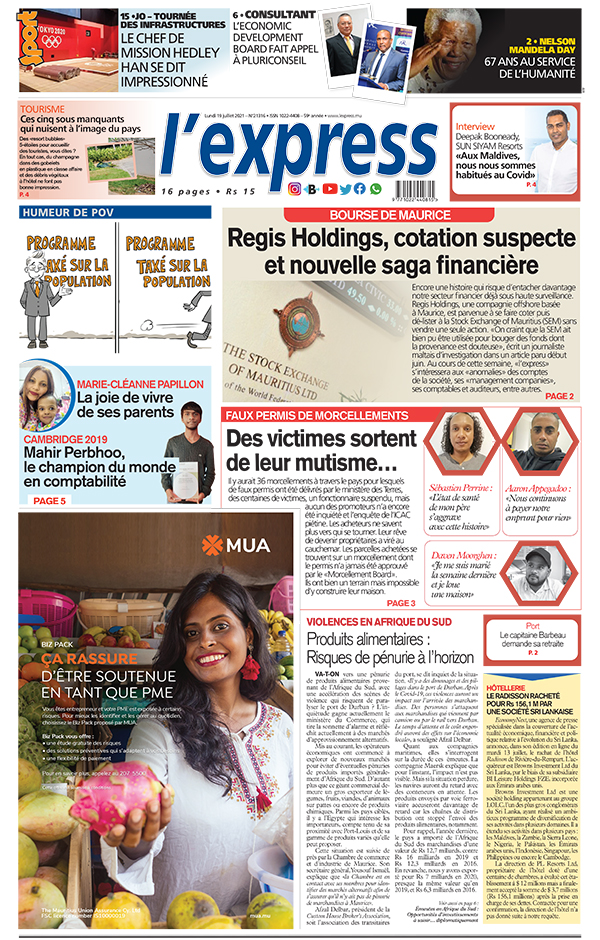 En une de l'express: Bourse de Maurice: Regis Holdings, cotation suspecte et nouvelle saga financière ; Autre titre: Faux permis de morcellements: des victimes sortent de leur mutisme…