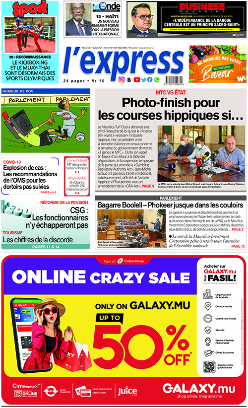 En une de l'express: MTC VS État : Photo-finish pour les courses hippiques si… ; Autre titre: COVID-19 - Explosion de cas : Les recommandations de l’OMS pour les dortoirs pas suivies.