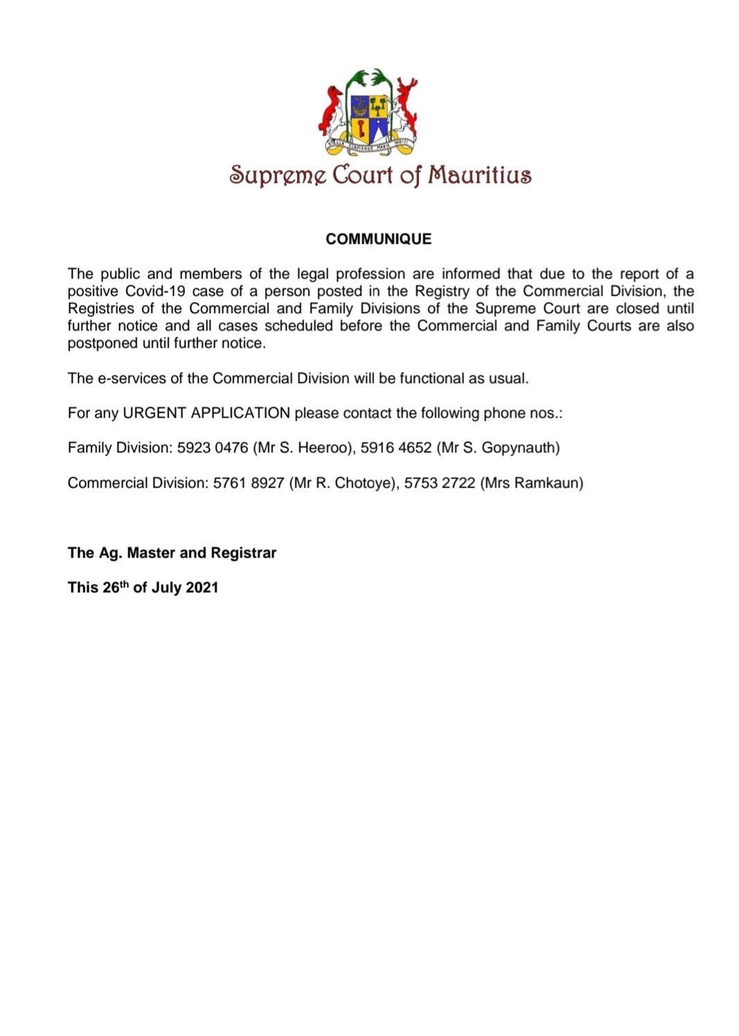 Par ailleurs, après qu’un cas cas positif au Covid-19 ait été détecté chez un personnel du greffe de la division commerciale de la Cour Suprême, celle-ci a émis un communiqué ce lundi matin.