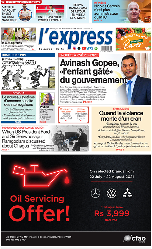 En une de l'express de ce mardi 27 juillet: Enquête à Rivière-Noire : Avinash Gopee, «l’enfant gâté» du gouvernement ; Autre titre: Covid-19 : Le nouveau système d’annonce suscite des interrogations.