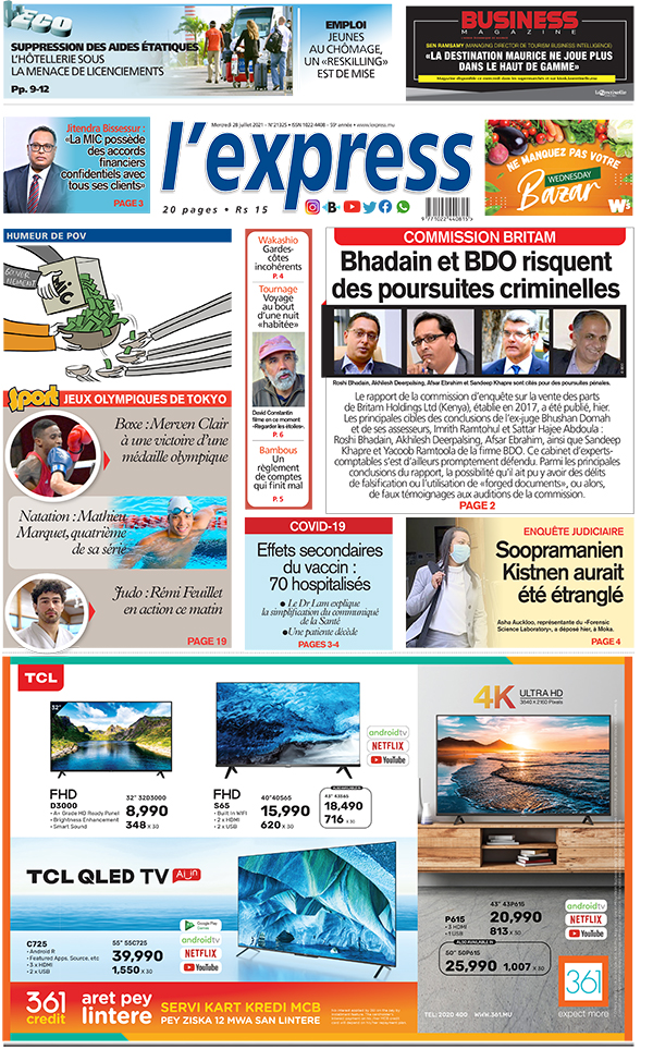 Le rapport de la commission d’enquête sur la vente des parts de Britam Holdings Ltd (Kenya), établie en 2017, a été publié, hier. Les principales cibles des conclusions de l’ex-juge Bhushan Domah et de ses assesseurs, Imrith Ramtohul et Sattar Hajee Abdoula : Roshi Bhadain, Akhilesh Deerpalsing, Afsar Ebrahim, ainsi que Sandeep Khapre et Yacoob Ramtoola de la firme BDO. Ce cabinet d’expertscomptables s’est d’ailleurs promptement défendu. Parmi les principales conclusions du rapport, la possibilité qu’il ait pu y avoir des délits de falsification ou l’utilisation de «forged documents», ou alors, de faux témoignages aux auditions de la commission.