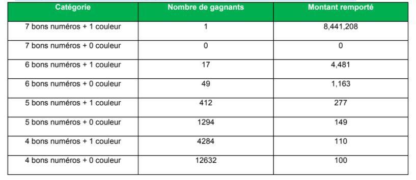 La combinaison gagnante de ce tirage du 6 août 2021 est : 05-10-13-19-24-26-28 et la couleur vert