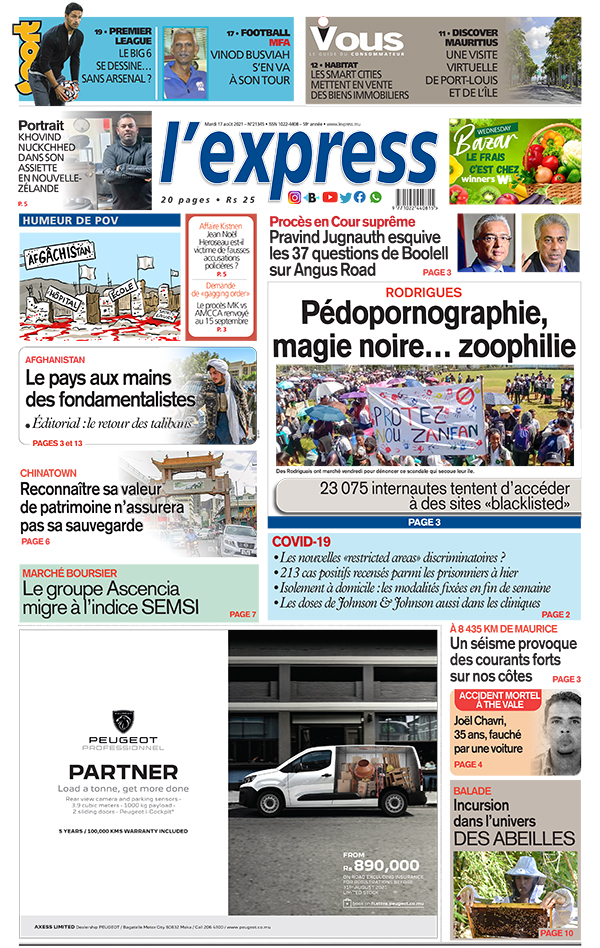 En une de l'express de ce mardi 17 août 2021: Rodrigues: pédopornographie, magie noire… zoophilie , Autre titre: Procès en Cour suprême: Pravind Jugnauth esquive les 37 questions de Boolell sur Angus Road.