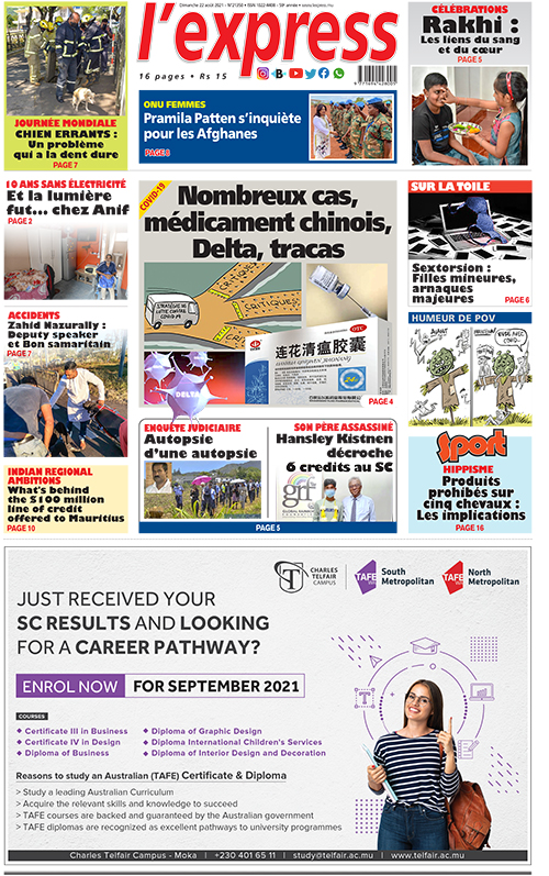 En une de l'express: Covid-19 : Nombreux cas, médicament chinois, Delta, tracas ; Autre titre: Sextorsion : Filles mineures, arnaques majeures.