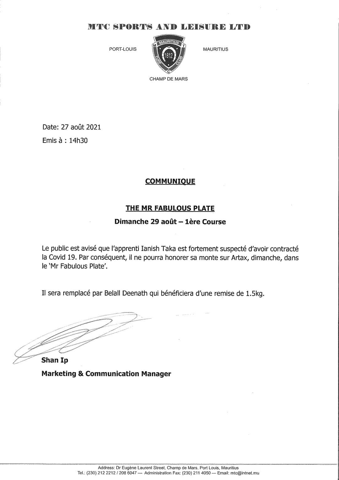Le jockey Belall Deenath remplacera Iansih Taka, ce dimanche 29 août au Champ-de-Mars. L’apprenti devait monter Artax dans la première course de The Mr Fabulous Plate. Mais il est suspecté d’avoir attrapé le Covid-19.