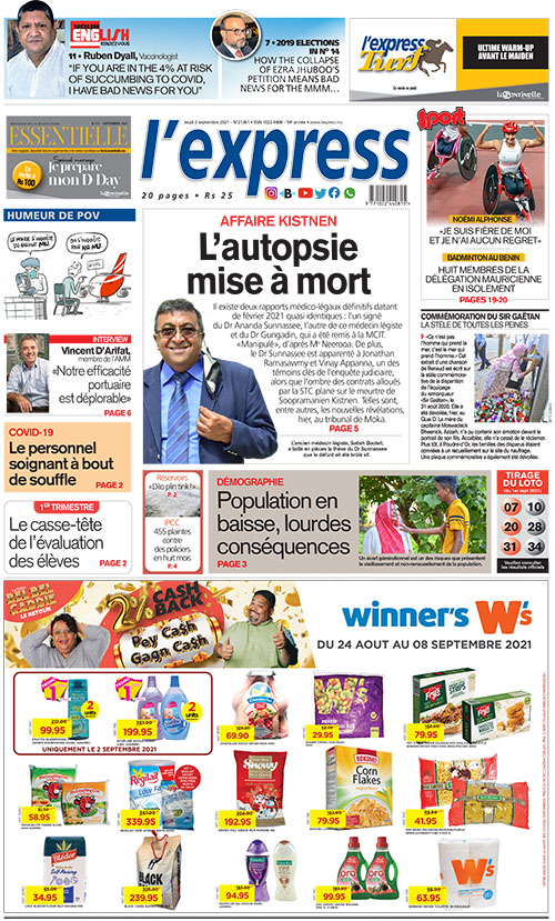 En Une de l'express: Affaire Kistnen : L’autopsie mise à mort ; Autre titre: Covid-19 : Le personnel soignant à bout de souffle.