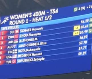 La Mauricienne Noémi Alphonse a décroché son ticket pour la finale du 400 m T54. Elle s’est classée 3e de la première série, ce jeudi 2 septembre, au Stade olympique de Tokyo. La para-athlète de 25 ans a établi un nouveau record d’Afrique (55.99). Elle a effacé le chrono de Brandy Perrine (57.52) des tablettes. Brandy Perrine a terminé 5e de la deuxième série (58.72) de l’épreuve et n’a pas été repêchée.
