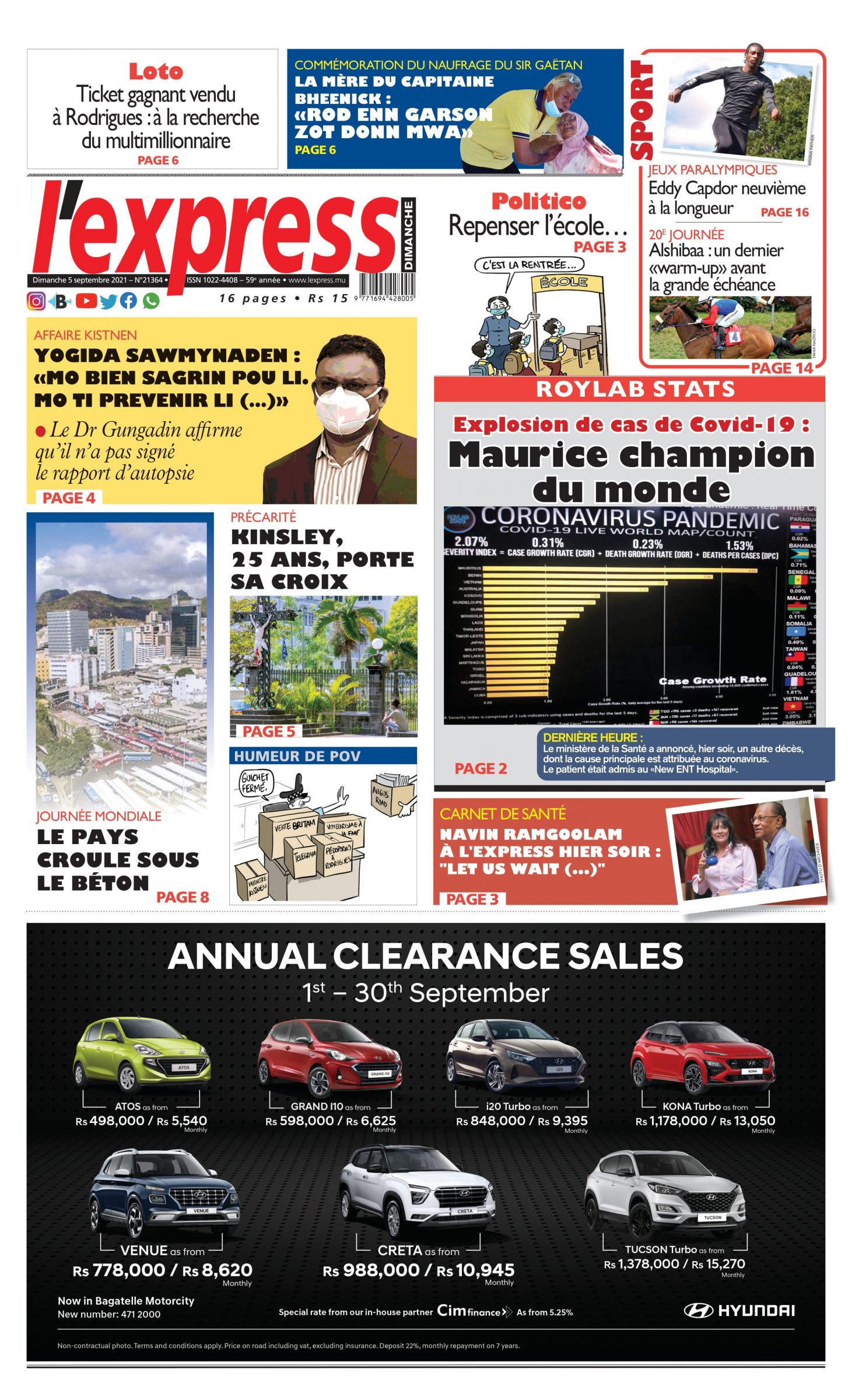 En Une de l'express:Explosion de cas de Covid-19 : Maurice en pole position.Autre titre ;Yogida Sawmynaden : «mo bien sagrin pou li. Mo ti prevenir li (…)»