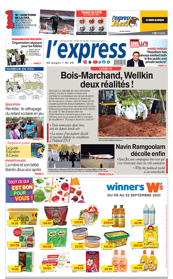 En une de l'express: Covid-19: Bois-Marchand, Wellkin deux réalités ! Autre titre: Départ de Ramgoolam en Inde: une journée sur les nerfs