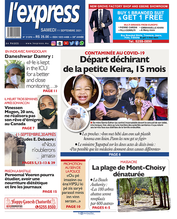 En un de l'express: Contaminée au Covid-19: départ déchirant de la petite Keira, 15 mois ; Autre titre: Promotion à la police: frustrations au sein du GIPM.