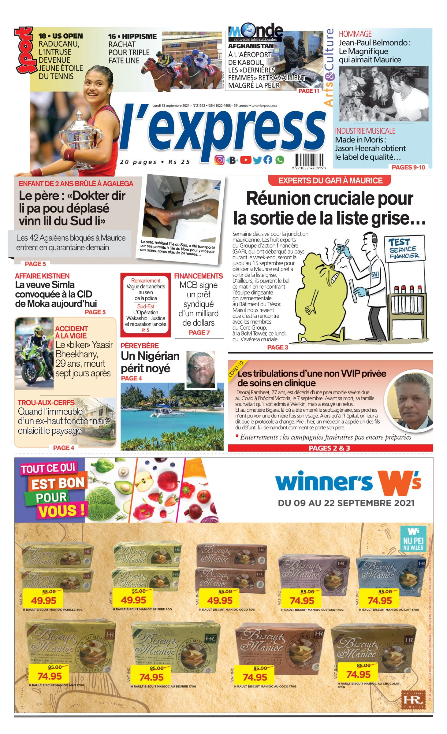 En Une de l'express:;Experts du GAFI à Maurice: Réunion cruciale pour la sortie de la liste grise…Autre titre; Enfant de 2 ans brûlé à Agalega;Le père : «Dokter dir li pa pou déplasé vinn lil du Sud li»