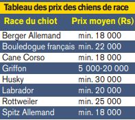 Ce sont les chiens griffons qui coûtent le moins cher en général. Il faut compter entre Rs 5 000 et Rs 10 000 pour commencer. Le prix d’un chiot Cane Corso ou d’un Spitz allemand s’élève à Rs 18 000 au minimum. Dans un post publié sur une page d’annonce le 25 août, un Bouledogue français de trois mois se vendait à Rs 22 000. Pour les bébés Rottweiler, il faudra débourser de Rs 25 000 à monter. Idem pour les Labrador. Les Huskies sont les chiens de race qui suscitent beaucoup d’intérêt depuis ces dernières années et ils peuvent coûter au minimum Rs 30 000 chacun. Selon un éleveur qui détient un permis des autorités, ces prix sont justifiés par le fait que les chiens de race nécessitent des entraînements et repas coûteux. «Souvent, ils sont déjà vaccinés et vermifugés avant d’être vendus, ce qui explique le coût élevé. Il existe des abus de la part des éleveurs illégaux.»