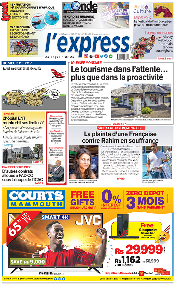 En une de l'express: Journée mondiale: le tourisme dans l’attente… plus que dans la proactivité ; Autre titre: Viol, sextorsion, menaces…: la plainte d’une Française contre Rahim en souffrance
