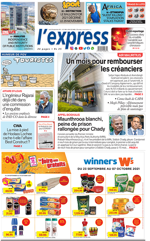 En une de l'express: Air Mauritius : Un mois pour rembourser les créanciers; Autre titre: Appel Boskalis : Maunthrooa blanchi, peine de prison rallongée pour Chady.