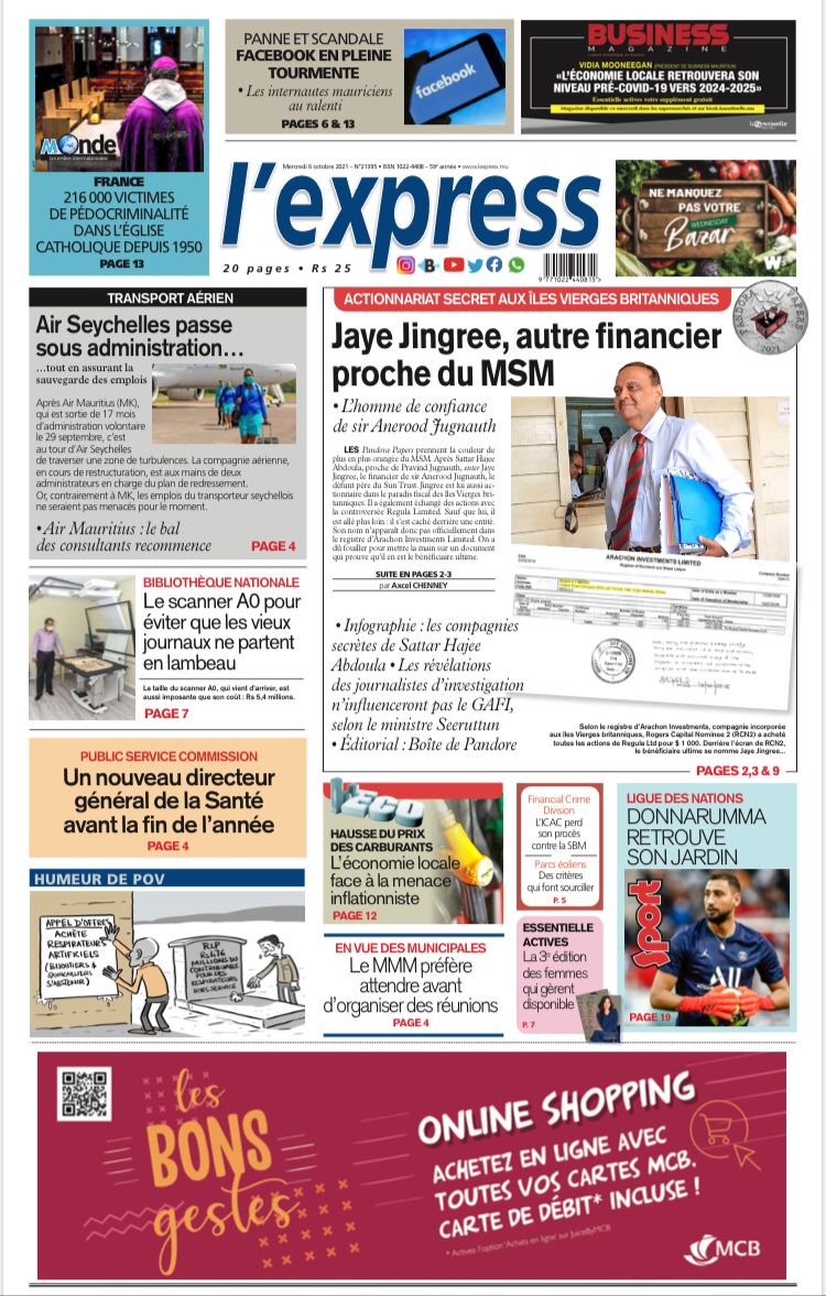 En une de l'express: Actionnariat secret aux îles Vierges britanniques: Jaye Jingree, autre financier proche du MSM; Autre titre: Transport aérien: Air Seychelles passe sous administration…