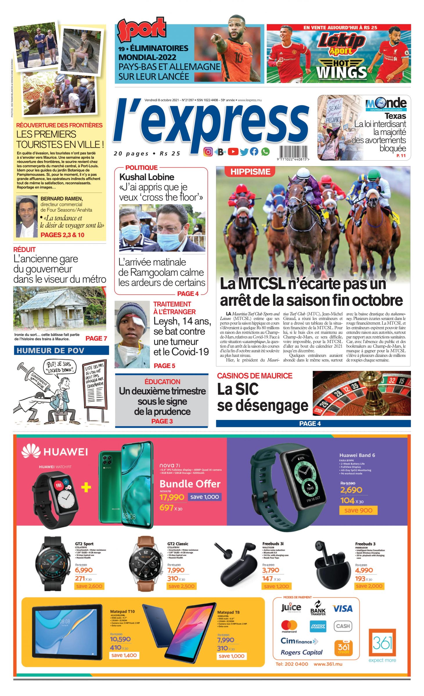 En une de l'express de ce vendredi 8 octobre 2021:La MTCSL n’écarte pas un arrêt de la saison fin octobre; Autre titre: Réouverture des frontières: les premiers touristes en ville !