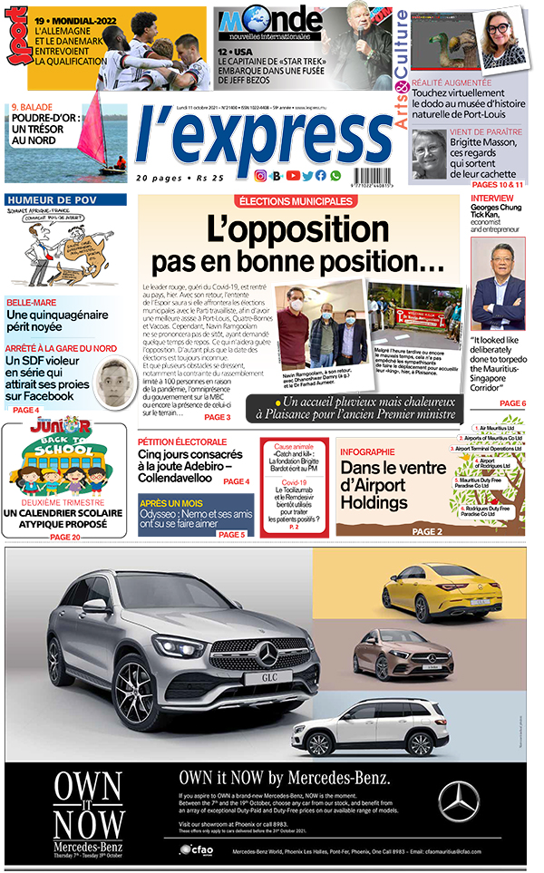 En une de l'express: Élections municipales: l’opposition pas en bonne position… Autre titre: Belle-Mare: une quinquagénaire périt noyée