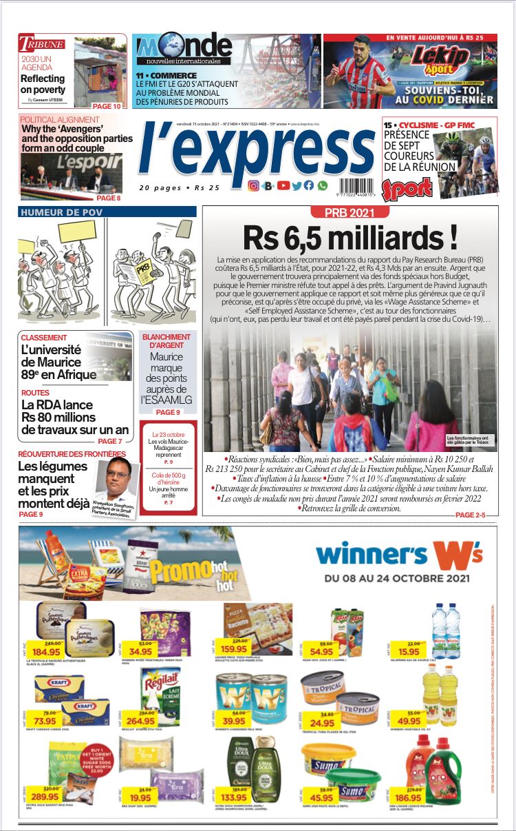 En une de l'express: PRB 2021: Rs 6,5 milliards ! Autre titre: Classement: L’université de Maurice 89e en Afrique.