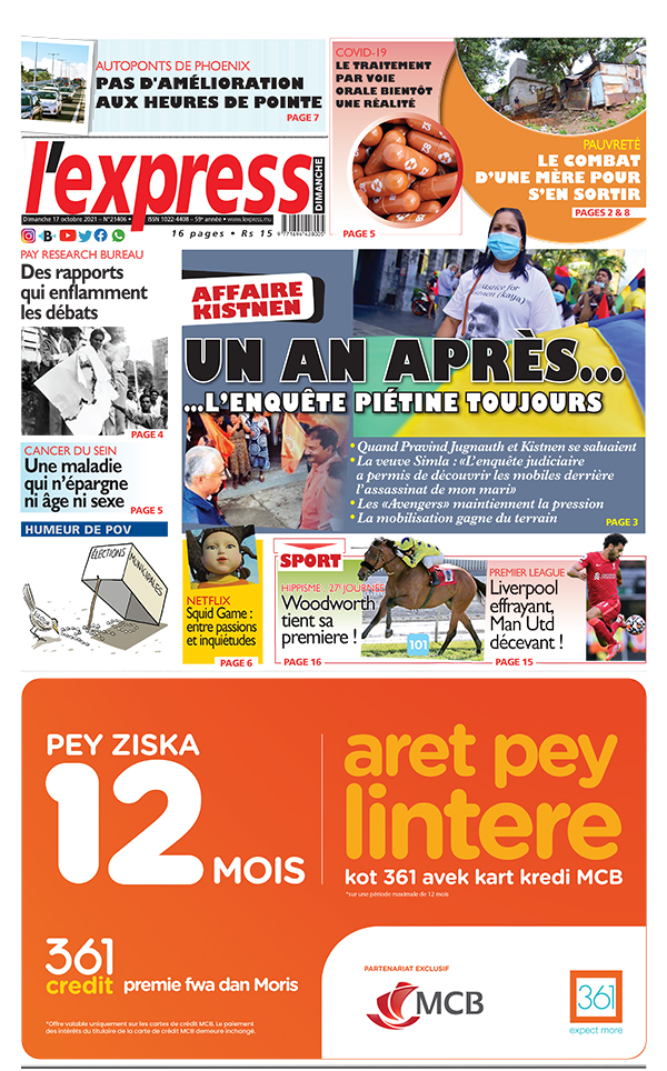 En une de l'express: Affaire Kistnen: un an après… …l’enquête piétine toujours ; Autre titre: Pay Research Bureau: des rapports qui enflamment les débats