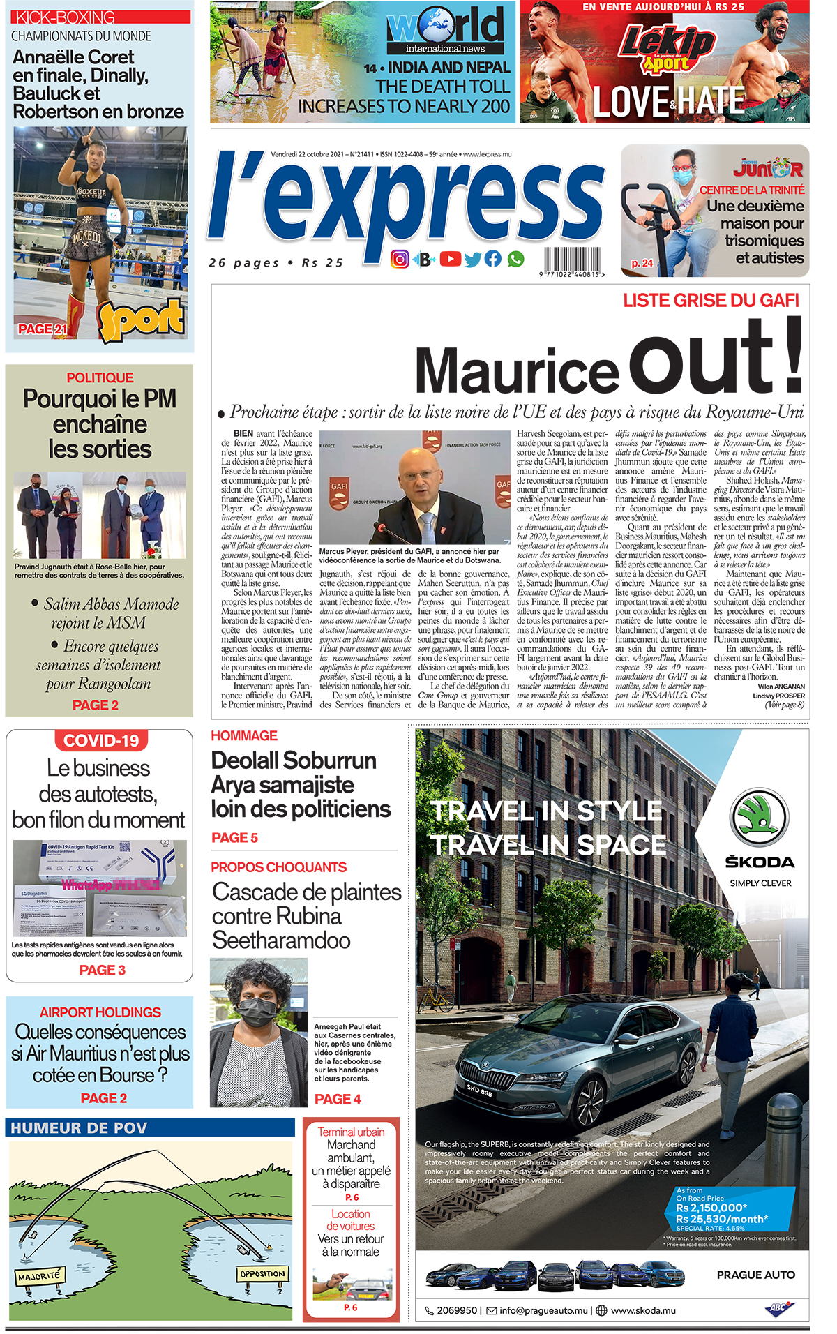 En Une de l'express, Liste grise du GAFI : Maurice out ! Autre titre; Politique : Pourquoi le PM enchaîne les sorties.