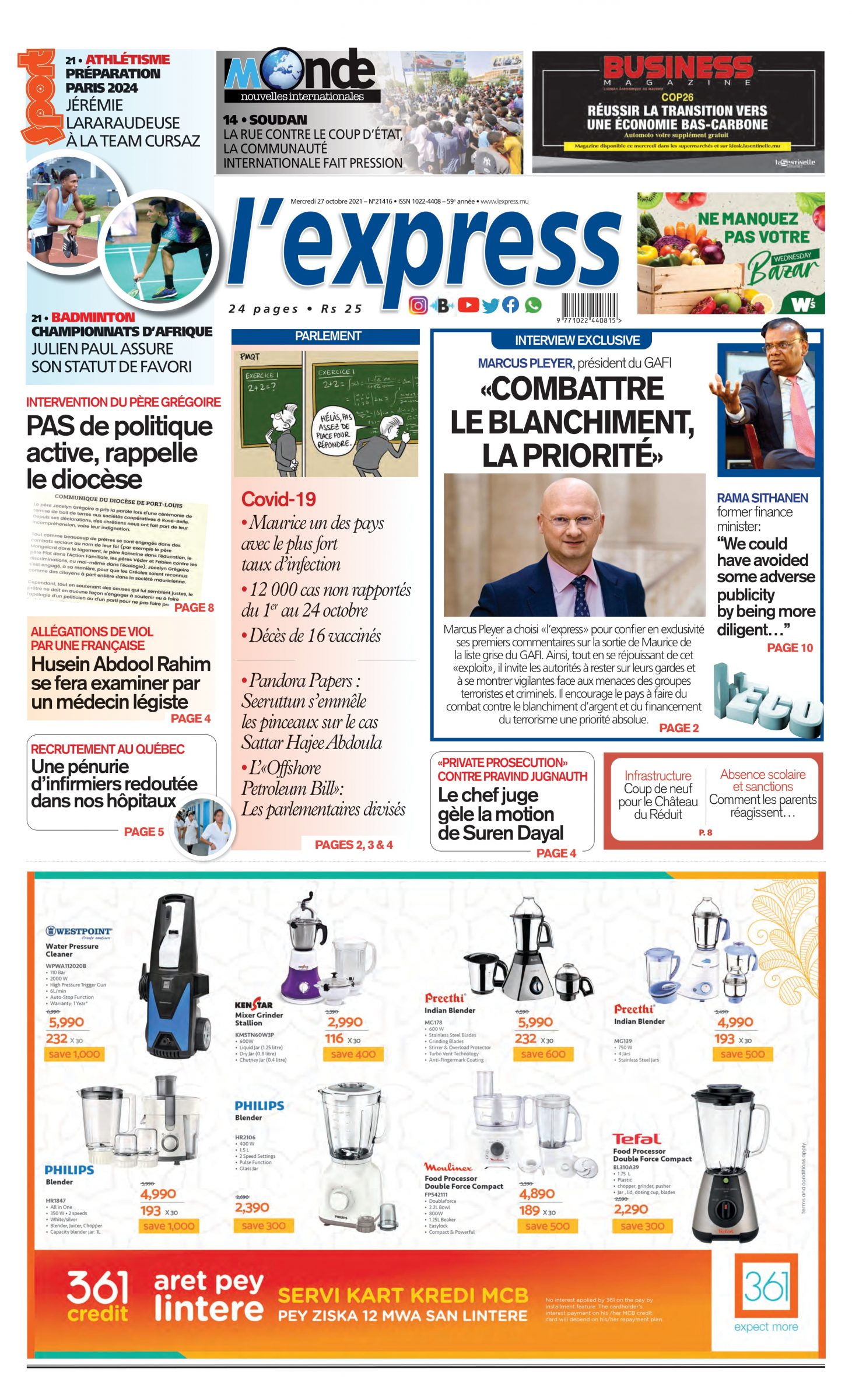 En une de l'express: Marcus Pleyer, président du GAFI: «Combattre le blanchiment, la priorité»; Autre titre; Maurice un des pays avec le plus fort taux d’infection.