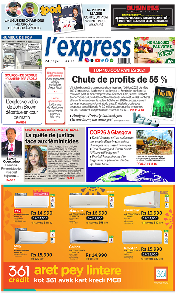 En une de l'express: Top 100 Companies 2021: chute de profits de 55 % ; Autre titre: Meurtre de Shaïna Hansye: les féminicides en hausse
