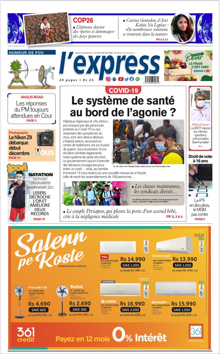 En une de l'express: Covid-19: Le système de santé au bord de l’agonie ? ; Autre titre: Angus Road: Les réponses du PM toujours attendues en Cour.