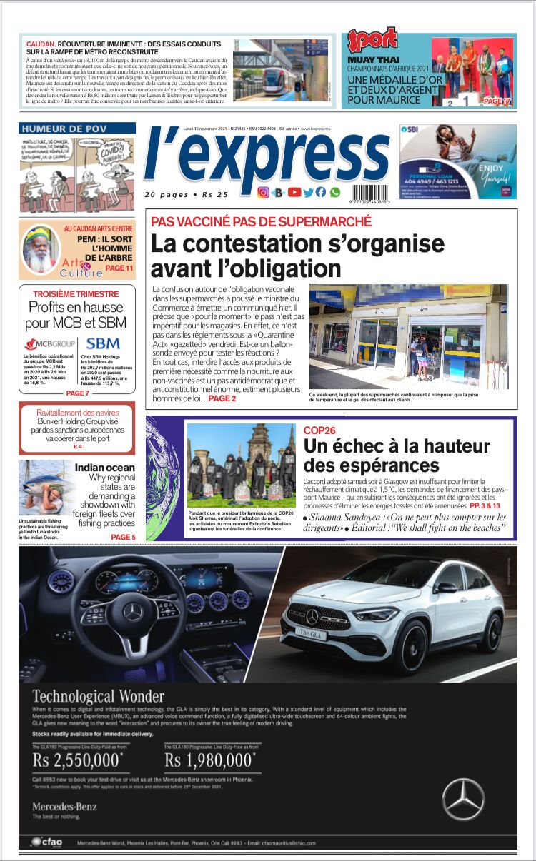 En une de l'express: Pas vacciné pas de supermarché: La contestation s’organise avant l’obligation ; Autre titre: COP26: Un échec à la hauteur des espérances.