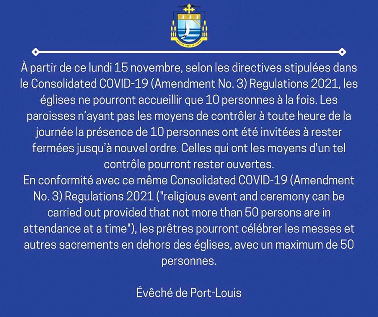 Après le décret du 12 novembre stipulant 10 personnes au maximum dans un lieu de culte mais 50 pour un mariage ou enterrement, le diocèse catholique avait émis un communiqué mentionnant 50 personnes à la messe. Ce qui n’allait pas strictement contre les regulations mais étaient, pour dire le moins, ambiguës. Hier l’Evêché a émis un autre communiqué (voir plus loin), qui n’est pas plus clair. Le communiqué précise que les églises et chapelles qui ne peuvent pas contrôler le nombre de fidèles, doivent rester fermées. Les fidèles, qui ne voient pas la différence entre une messe, une cérémonie de mariage ou un enterrement, sont remontés et dénoncent le caractère irrationnel de ce règlement.
