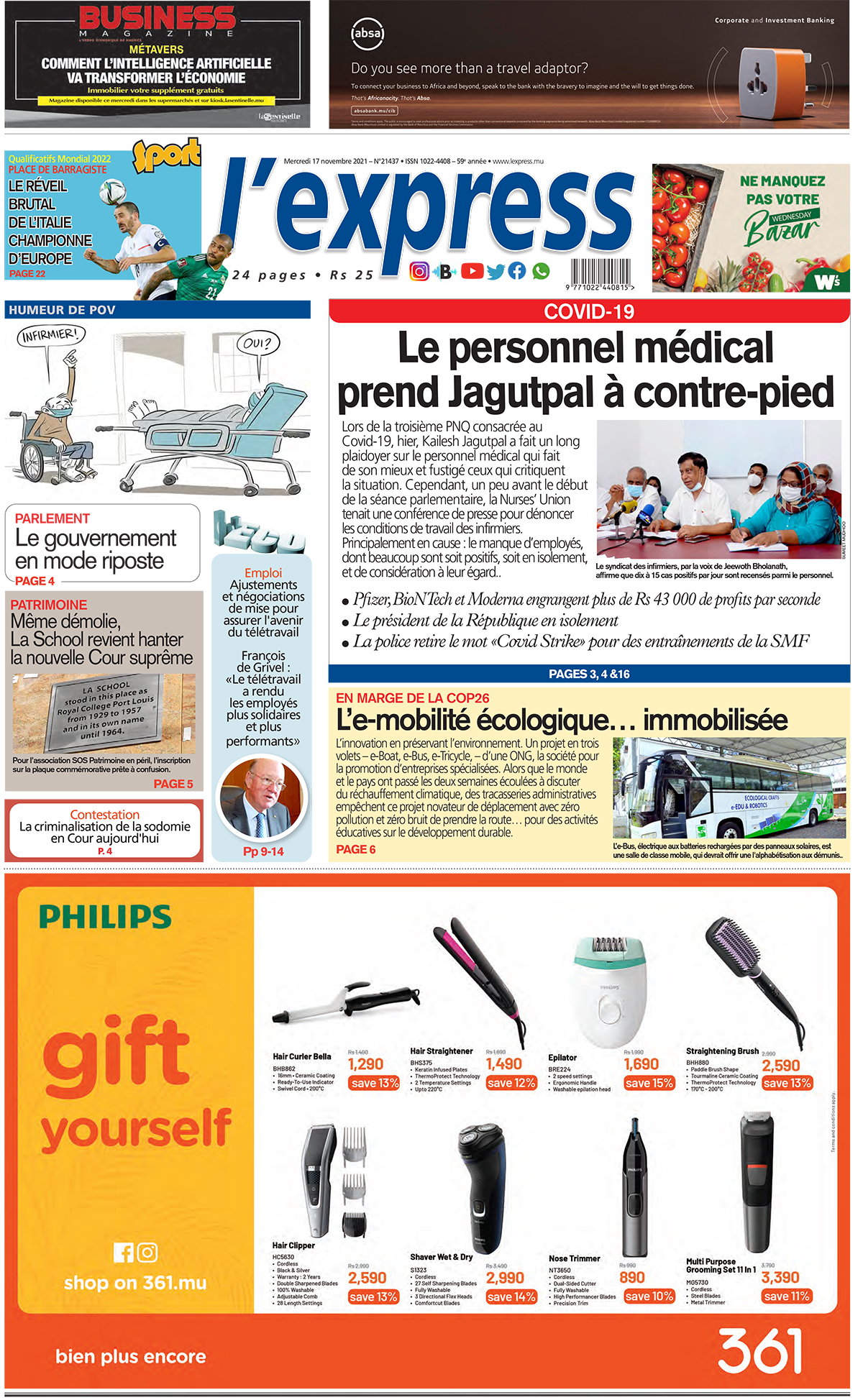 En Une de l'express; Covid-19 : Le personnel médical prend Jagutpal à contre-pied; Autre titre; En marge de la COP26 : L’e-mobilité écologique… immobilisée.