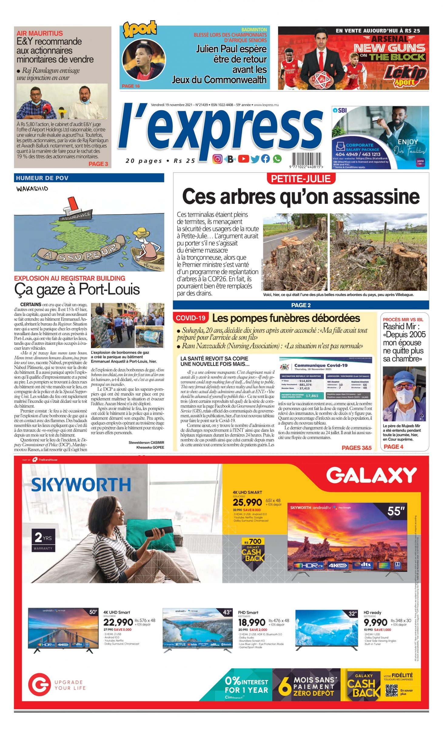Ces terminalias étaient pleins de termites, ils menaçaient la sécurité des usagers de la route à Petite-Julie… L’argument aurait pu porter s’il ne s’agissait du énième massacre à la tronçonneuse, alors que le Premier ministre s’est vanté d’un programme de replantation d’arbres à la COP26. En fait, ils pourraient bien être remplacés par des drains.