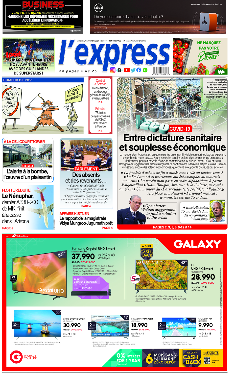 En Une de l'express; Covid-19 : Entre dictature sanitaire et souplesse économique; Autre titre; Flotte réduite : Le Nénuphar, dernier A330-200 de MK, finit à la casse dans l’Arizona.