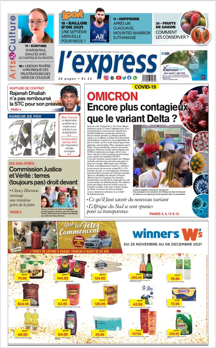 En une de l'express: Covid-19 – Omicron: Encore plus contagieux que le variant Delta ? ; Autre titre: Dix ans après - Commission Justice et Vérité : terres (toujours pas) droit devant.