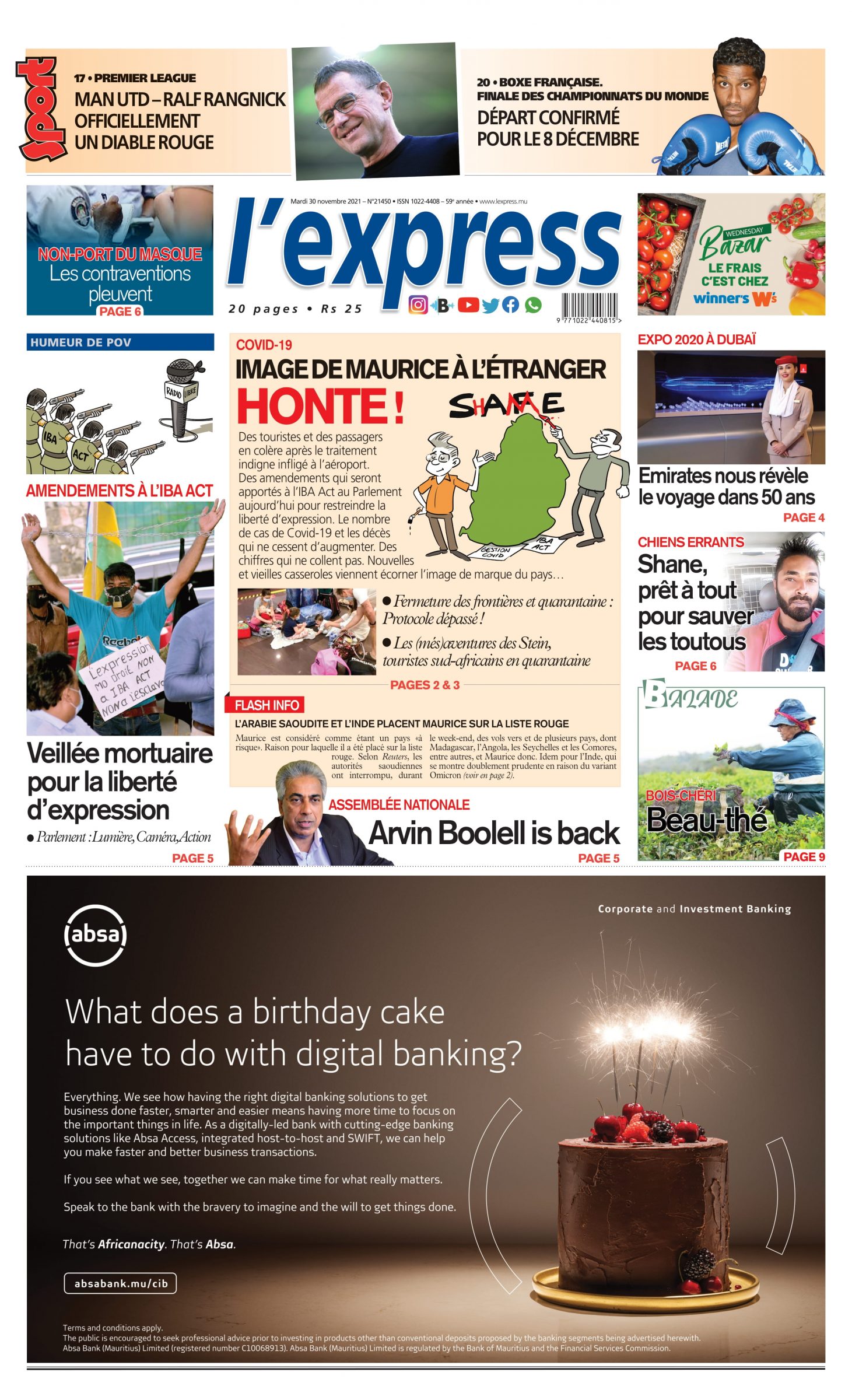 En une de l'express; Image de maurice à l’étranger: honte ! Autre titre; L’arabie Saoudite et l’Inde placent maurice sur la liste rouge.