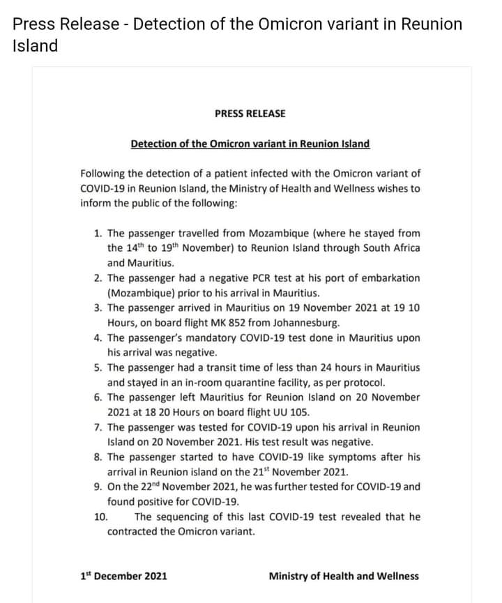 [Communiqué] Variant Omicron: le test PCR du passager ayant transité par Maurice était négatif