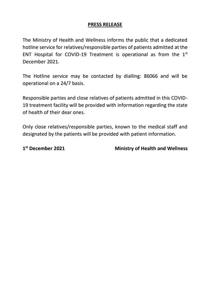 Le communiqué a été relayé sur la page Facebook du Government Information Service (GIS) en ce mercredi 1er décembre. Le ministère de la Santé a mis en place une hotline pour les proches des patients atteints du Covid-19, et qui sont admis à l’hôpital ENT. Elle sera opérationnelle 24 heures sur 24 et 7 jours sur 7, assure le communiqué. Le numéro à composer : 86066.