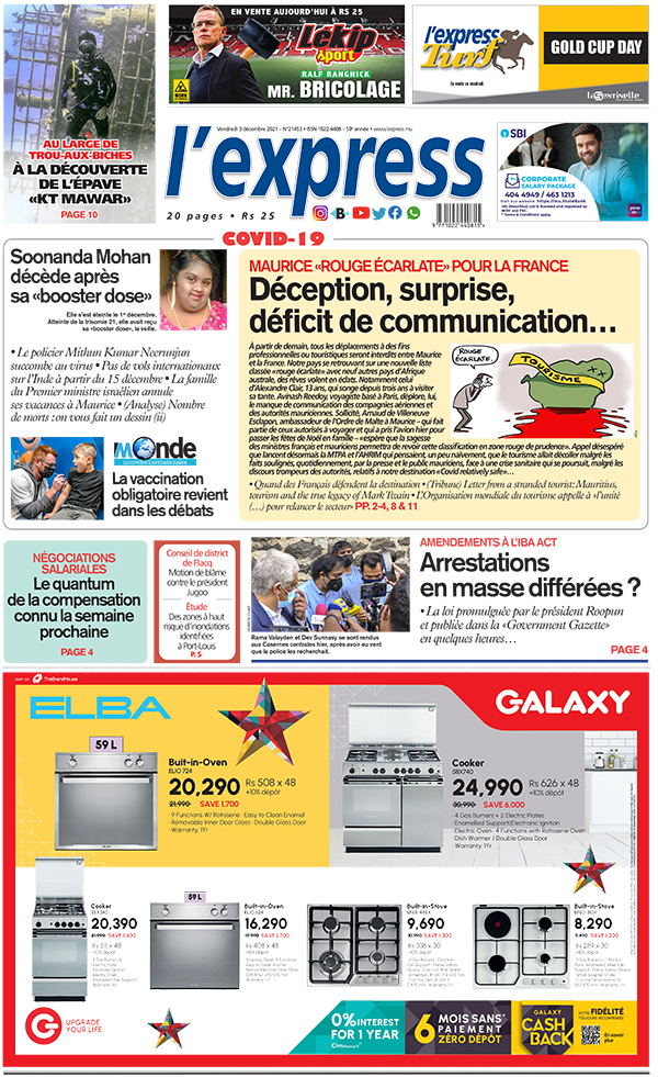 En une de l'express: Maurice «Rouge écarlate» pour la France: déception, surprise, déficit de communication… Autre titre: Soonanda Mohan décède après sa «booster dose»
