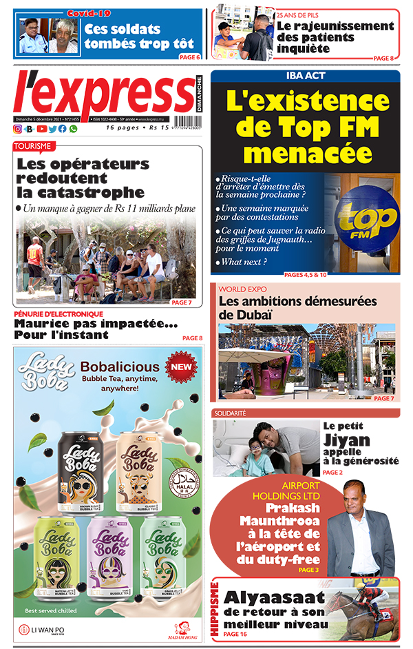 En une de l'express: IBA Act: l'existence de Top FM menacée ; Autre titre: Tourisme: les opérateurs redoutent la catastrophe